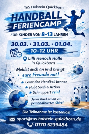 Der TuS Holstein Quickborn bietet für die Osterferien ein kostenfreien Handball Camp an. Jedes Kind bekommt ein personalisiertes T Shirt. Jetzt...anmelden unter sport@tus-holstein-quickborn.de oder unter 0170 5239484. Unter der Handynummer stehen wir ihnen für weitere Fragen gerne zur Verfügung. Wir freuen uns auf ihre Kinder.